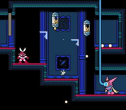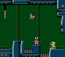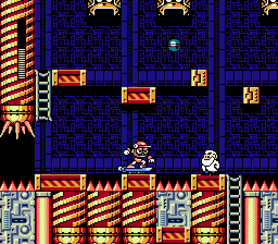 After a brief, dimly-lit hallway of MetFire and Sparky enemies, Mega Man will arrive at a door leading into the first floor hub. The hub has no gimmicks, just ladders and platforms among the eight mini-stage portals.