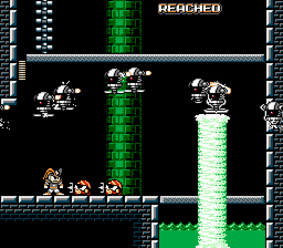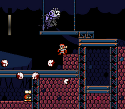 In this cliffside level, periodic quakes (indicated by a countdown at the top of the screen) will bounce Mega Man, pickups and enemies high off the ground they were standing on. These quakes often come in conjunction with downward scrolling platforms, Guitar Platforms and spiky ceilings, with one or two Trombys causing trouble where the quakes die down.