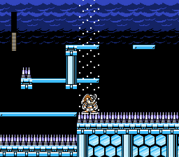 The main gimmick of this wintry level is snowfall (sometimes sprinkled down by a Fooley) that makes Mega Man invincible while standing under it. A lengthy (and hopefully harmless) walk across a spike pit leads into a series of Key Barrier puzzles involving arrow and napalm traps that will hurt Mega Man if he's not standing under the snowfall.