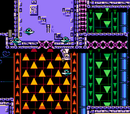 This temple-themed level contains several enemies crossed with Blocky, such as Swim Balls, Bubukan MK-IIs, and Browns. While contending with these detachable enemies, Mega Man must traverse the darker parts of the temple carefully, as the purple platforms, walls and ladders only become visible when he gets close to them.